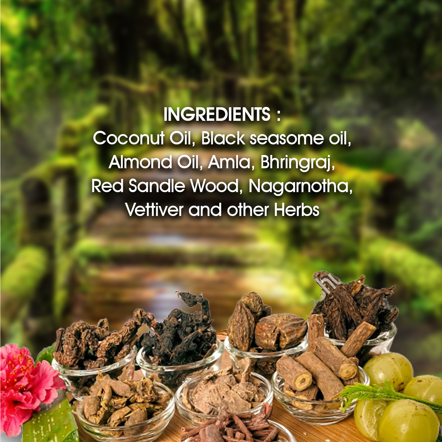 A COMPLETE AYURVEDIC HAIR CARE SOLUTION This oil is ideal for managing dandruff, dry scalp, and hair breakage. With regular use, it supports the appearance of naturally dark hair and helps maintain healthy hair color without the use of synthetic dyes or harsh chemicals.
