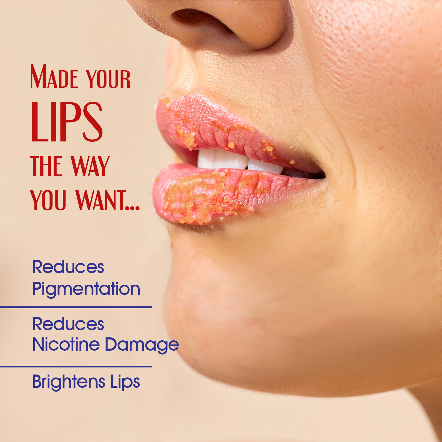 - Natural lip scrub is specially designed to work on tanned or nicotine affected lips and restore their original colour.